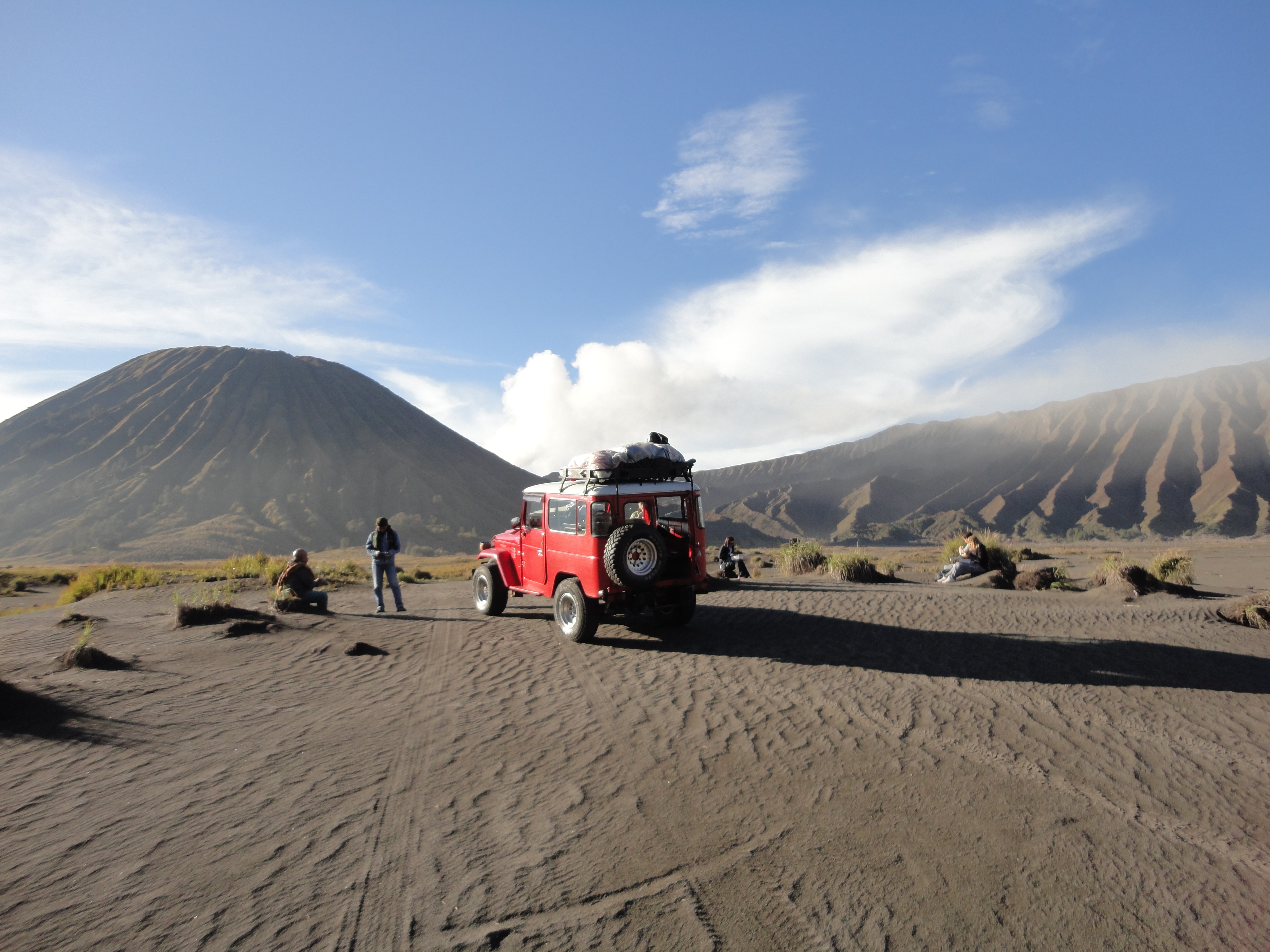 In einem Feld von 4×4 Jeeps rasten wir wie im Rallye Dakar über die Wüstenlandschaft Richtung Fuss des aktiven Vulkanes Bromo, dessen letzte Eruption sich 2011 ereignet hatte.
