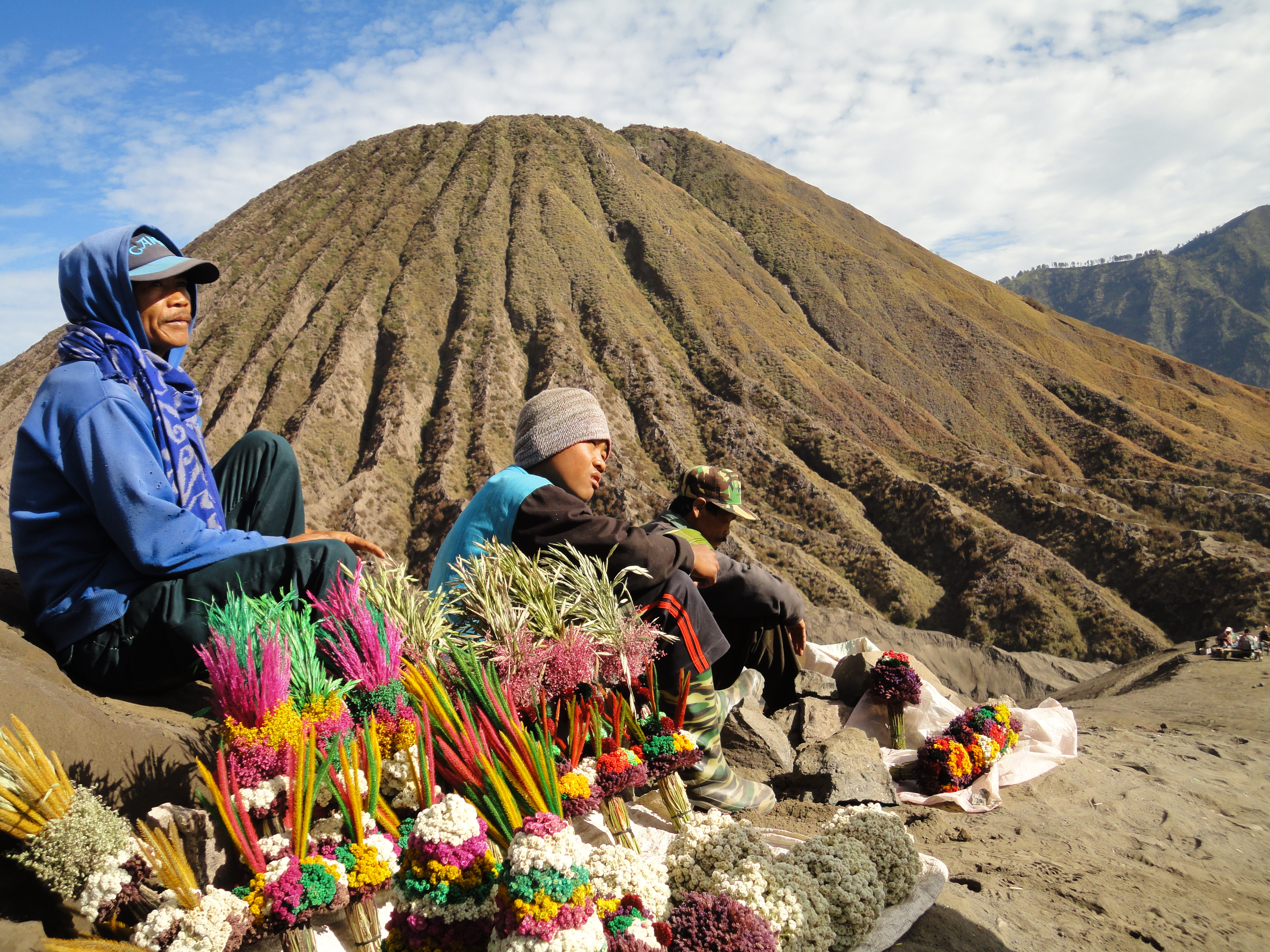 Verkäufer findet man überall, wo es Touristen gibt. Hier verkaufen sie Blumen als Opfergaben für den Vulkan.