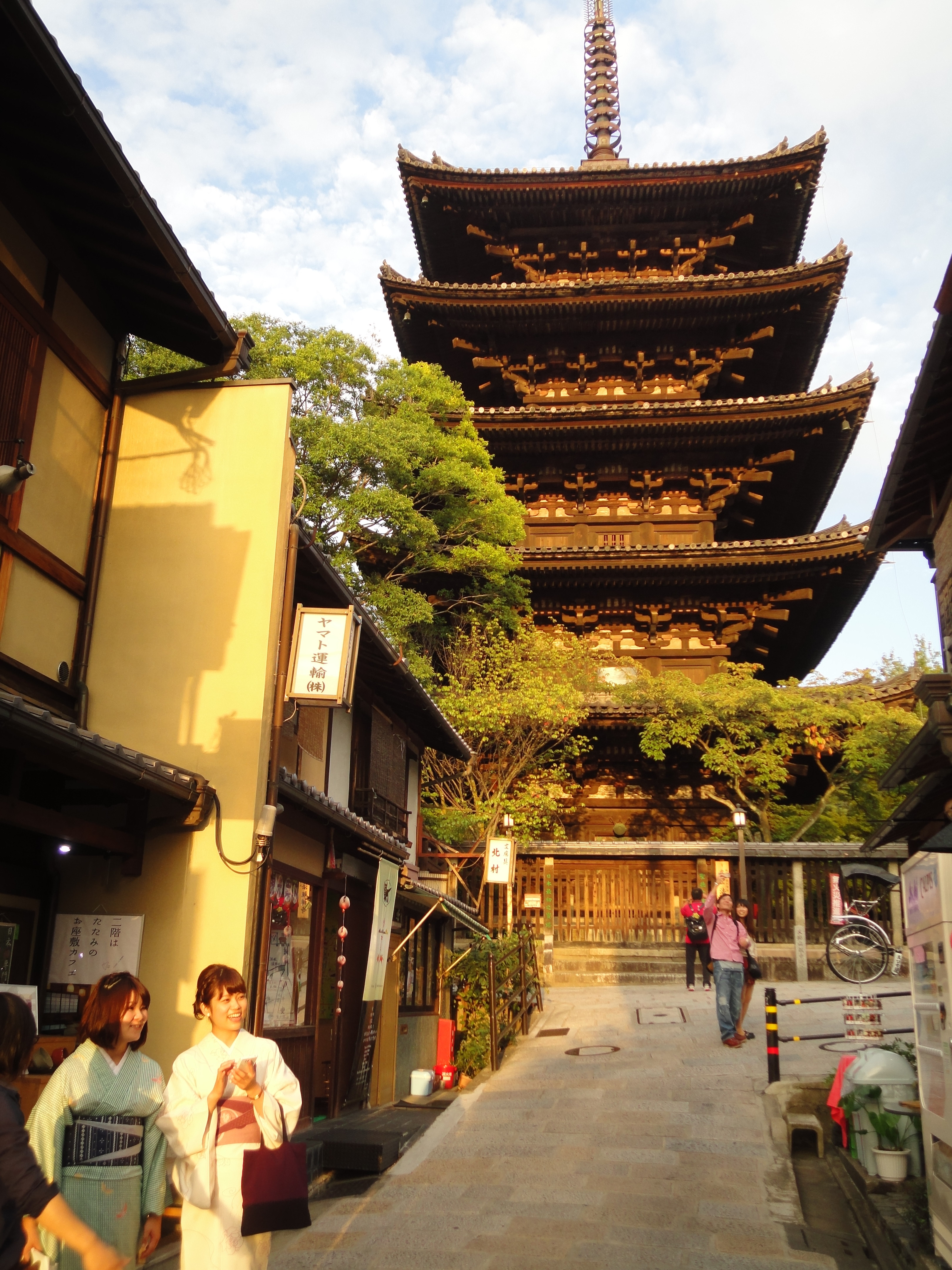 Unser Zimmer im Guesthouse Kiyomizu Sannenzaka war brandneu und für japanische Verhältnisse riesengross, doch fantastisch wurde die Unterkunft erst durch die ausserordentlich hilfsbereite einheimische Besitzerin und die sensationelle Lage in einem ruhigen Gässchen des Altstadtquartiers. Während des Tages zwängten sich jeweils Hunderte von Touristen durch die Gässchen. Viele der japanischen Touristen spazieren bei ihrem Besuch in Kyoto schön hergerichtet im Kimono und den traditionellen Holzsandalen durch die historische Stadt. Hierfür gibt es extra Packages, wo man von der kunstvoll geflochtenen Frisur, übers Makeup bis zur Miete des Kimonos für einen Tag alles dabei hat. Die zierlichen, japanischen Frauen sahen (einmal mehr) hervorragend aus, bei ihrer männlicher Begleitung wirkte der Kimono für uns etwas gewöhnungsbedürftig.