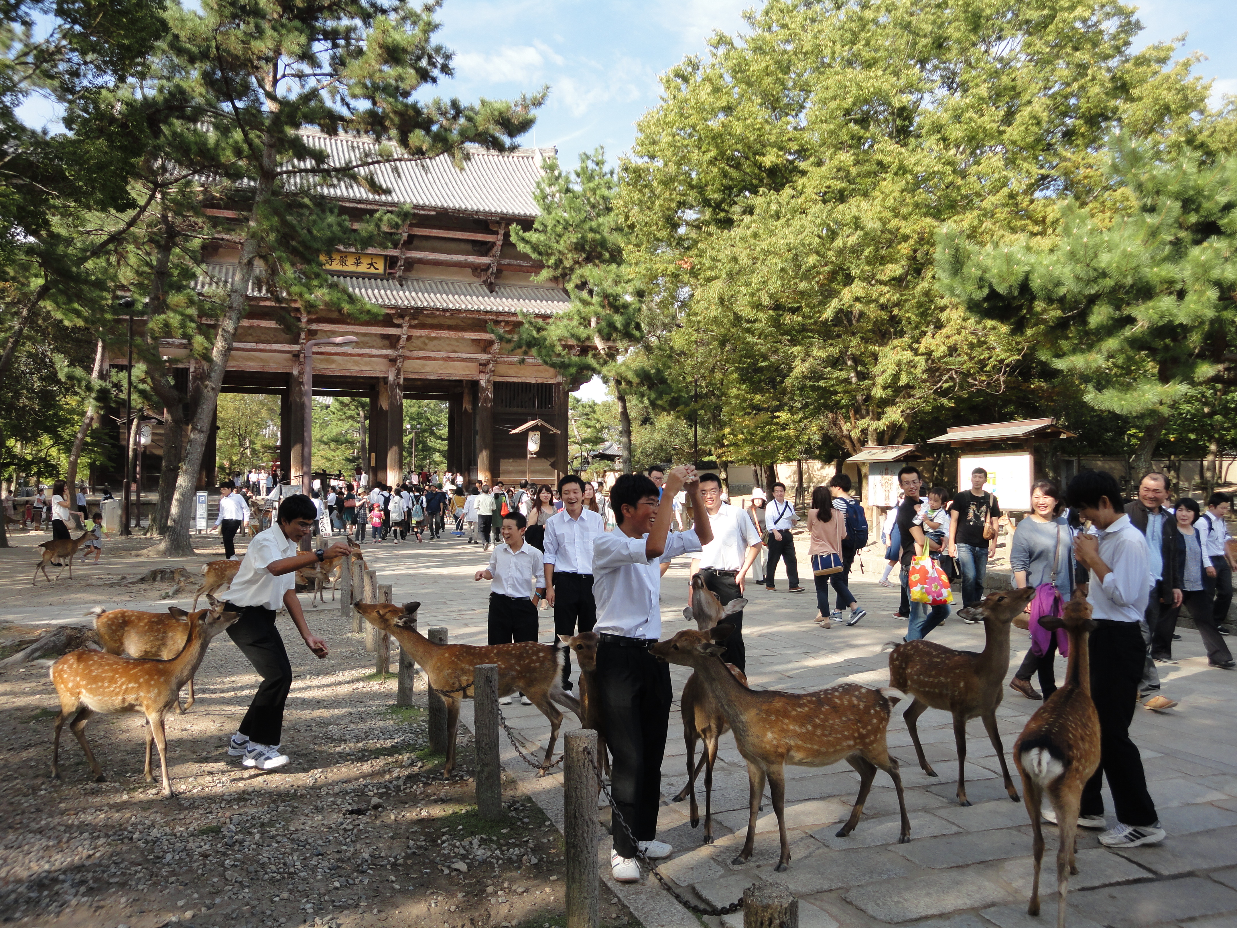 Vom Schulmädchen bis zum gestandenen Geschäftsmann mit Aktentasche hatten alle ein riesiges Gaudi, die Hirsche zu füttern. Auf uns wirkte das Spektakel etwas befremdlich und auch die Hinweisschilder mit Sätzen wie ¨Die Hirsche von Nara sind wilde Tiere, füttert sie nur mit Hirsch-Keksen¨ fanden wir etwas seltsam. Die Verkaufsstände mit Hirsch-Keksen waren zwar der Renner, doch wer die Kekse nicht gerade zur Hand hatte, fütterte den Hirschen von M&M über Pommes Chips bis zu Plastiktüten einfach alles. Einmal mehr mussten wir feststellen, dass die japanische Vorstellung von ¨wilder Natur¨ nicht mit der schweizerischen übereinstimmt…