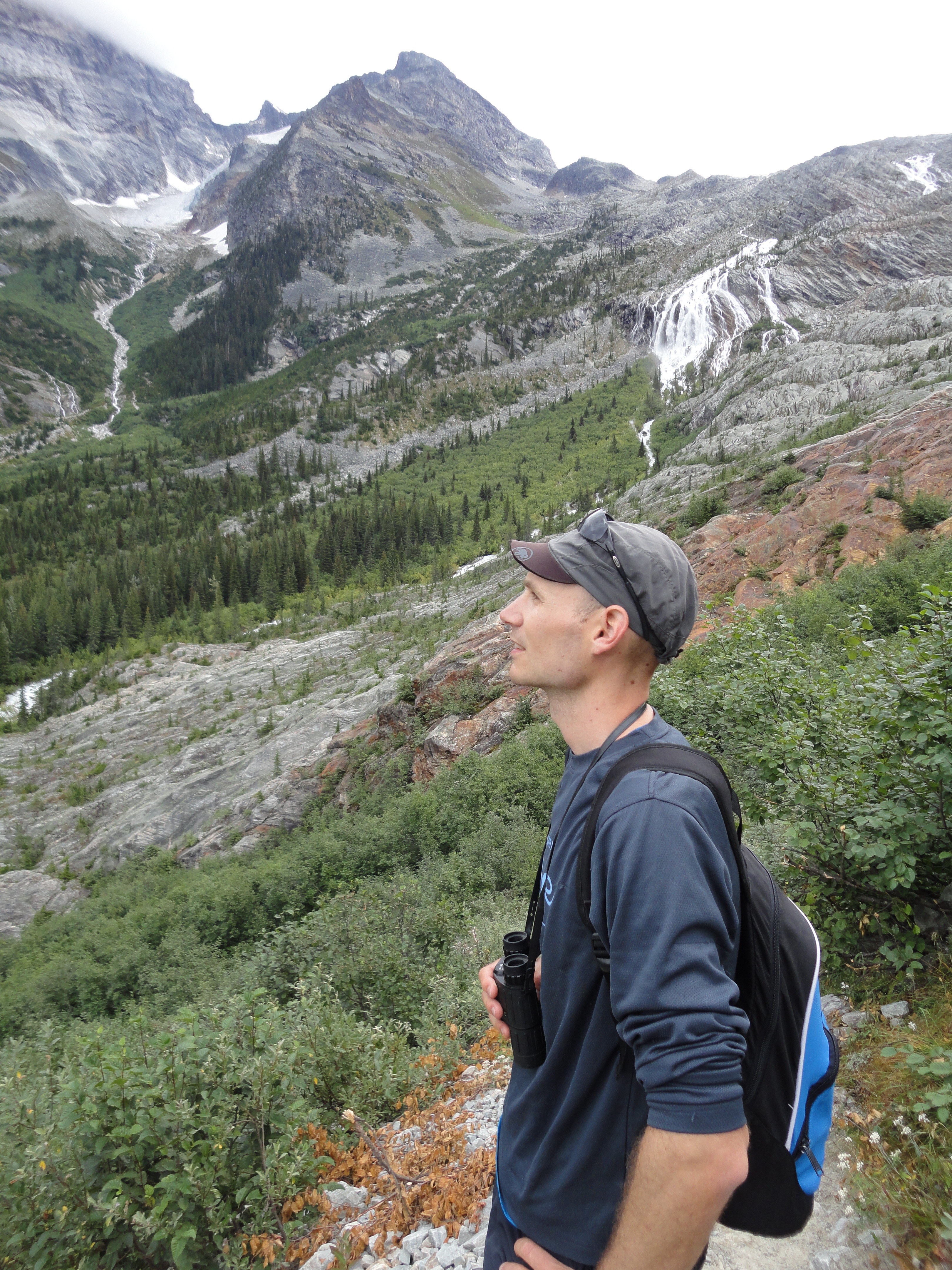 Wir fuehlten uns nach den ersten Wanderungen recht sicher, haben aber fuer den Notfall immer unseren Baerenspray zur Hand. Christian haelt mit dem Feldstecher immer nach Tieren Ausschau und siehe da……