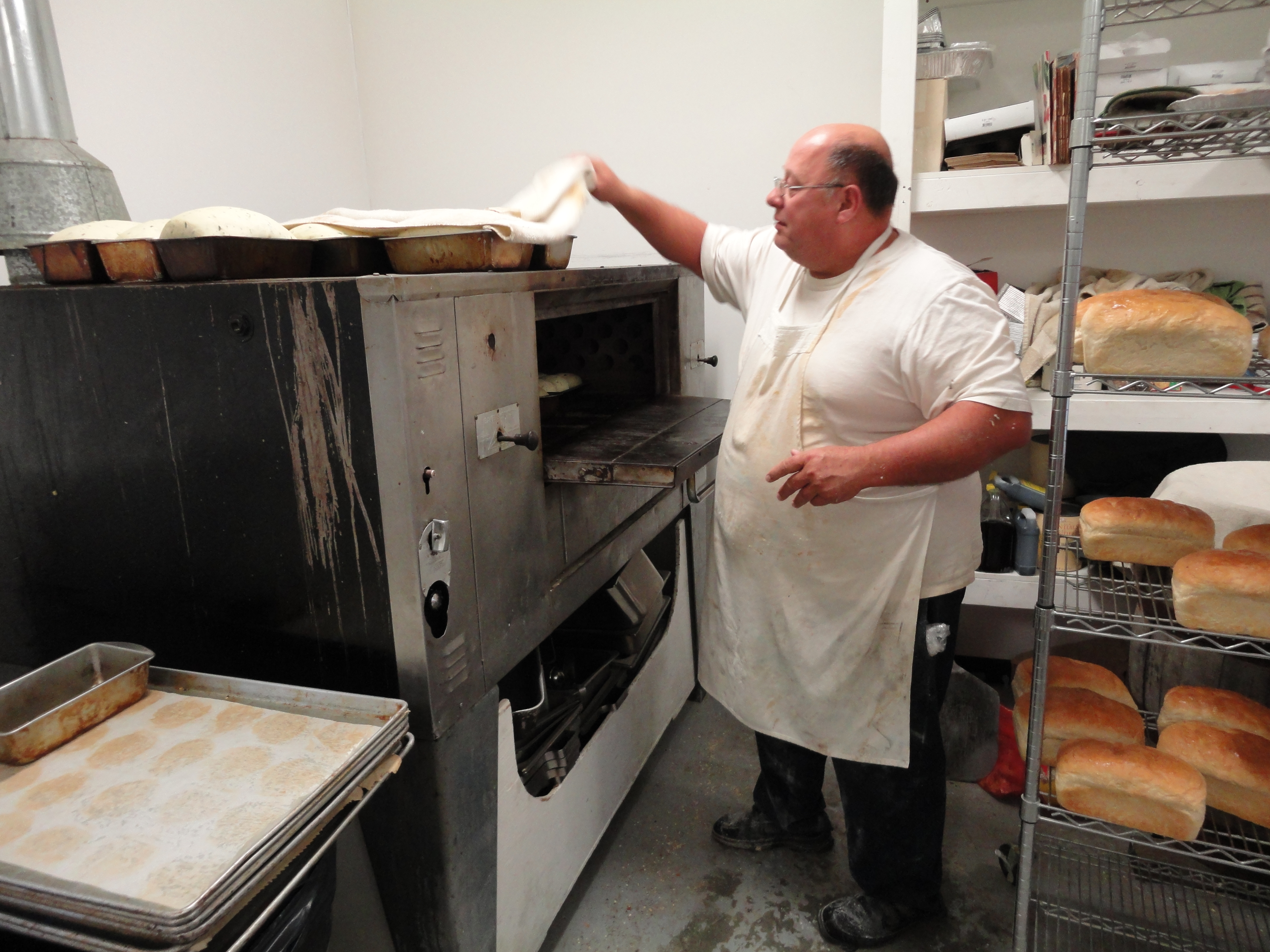 Aber oho, irgendwann ist er dann zum Baecker in der Brotproduktion aufgestiegen. Von Honig-Curry-Brot ueber Zimt-Rosinen-Brot bis zu Spinat-Feta-Brot werden woechentlich zig verschiedene Brote produziert und im Steinofen gebacken.