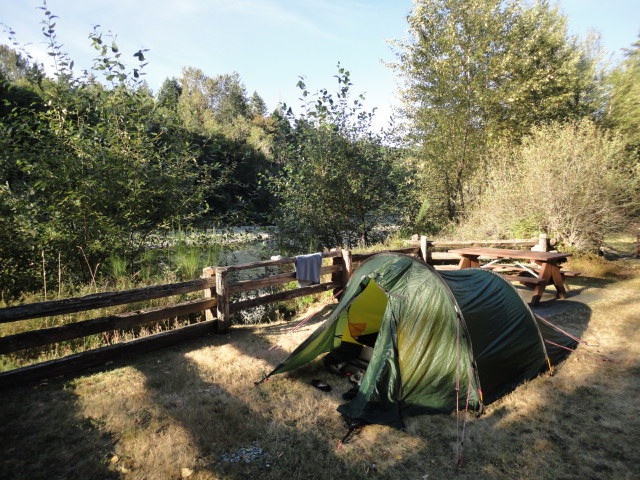 Nicht nur die Touristen, sondern auch die Einheimischen lieben es zu campen. Natürlich haben wir nichts reserviert und so kurven wir eines Abends herum, um noch irgendwo ein Plätzchen zu bekommen. Der Ranger eines Provincial Parks erbarmt sich schliesslich und offeriert uns eine Übernachtung direkt am Fluss. Frühstück in der Sonne, Morgen-Yoga und dann ein erfrischender Schwumm im klaren Fluss – was für ein perfekter Morgen.