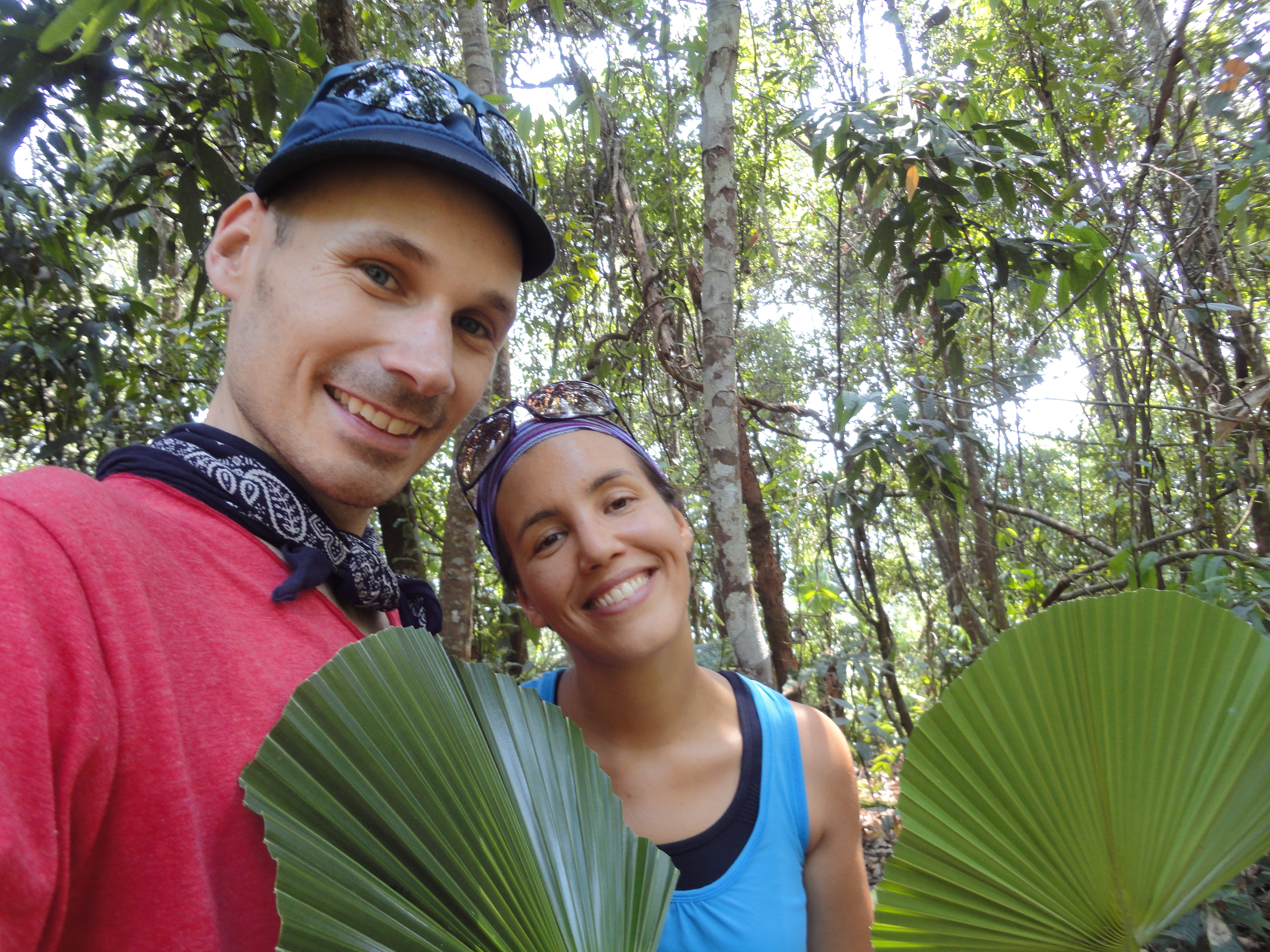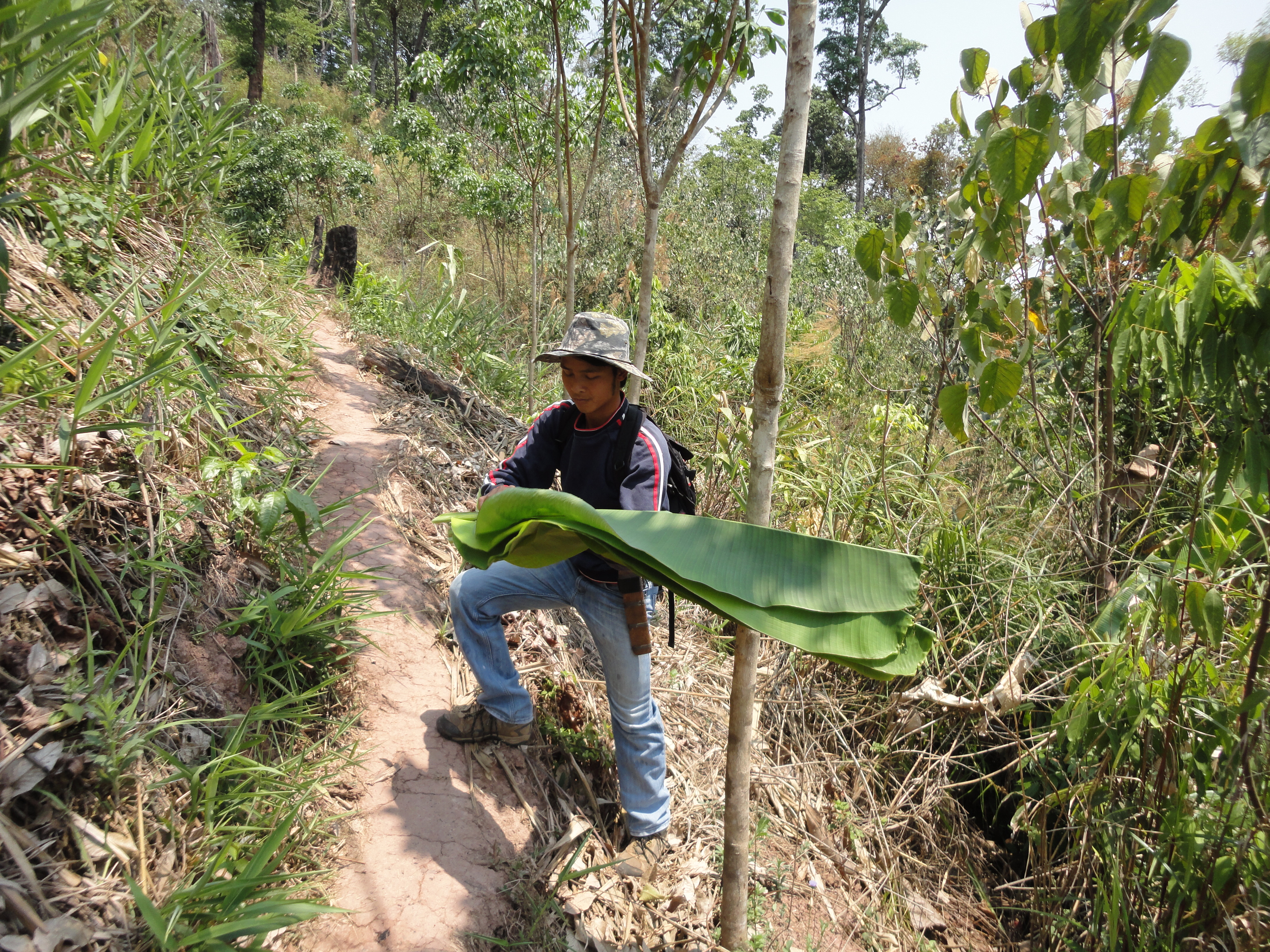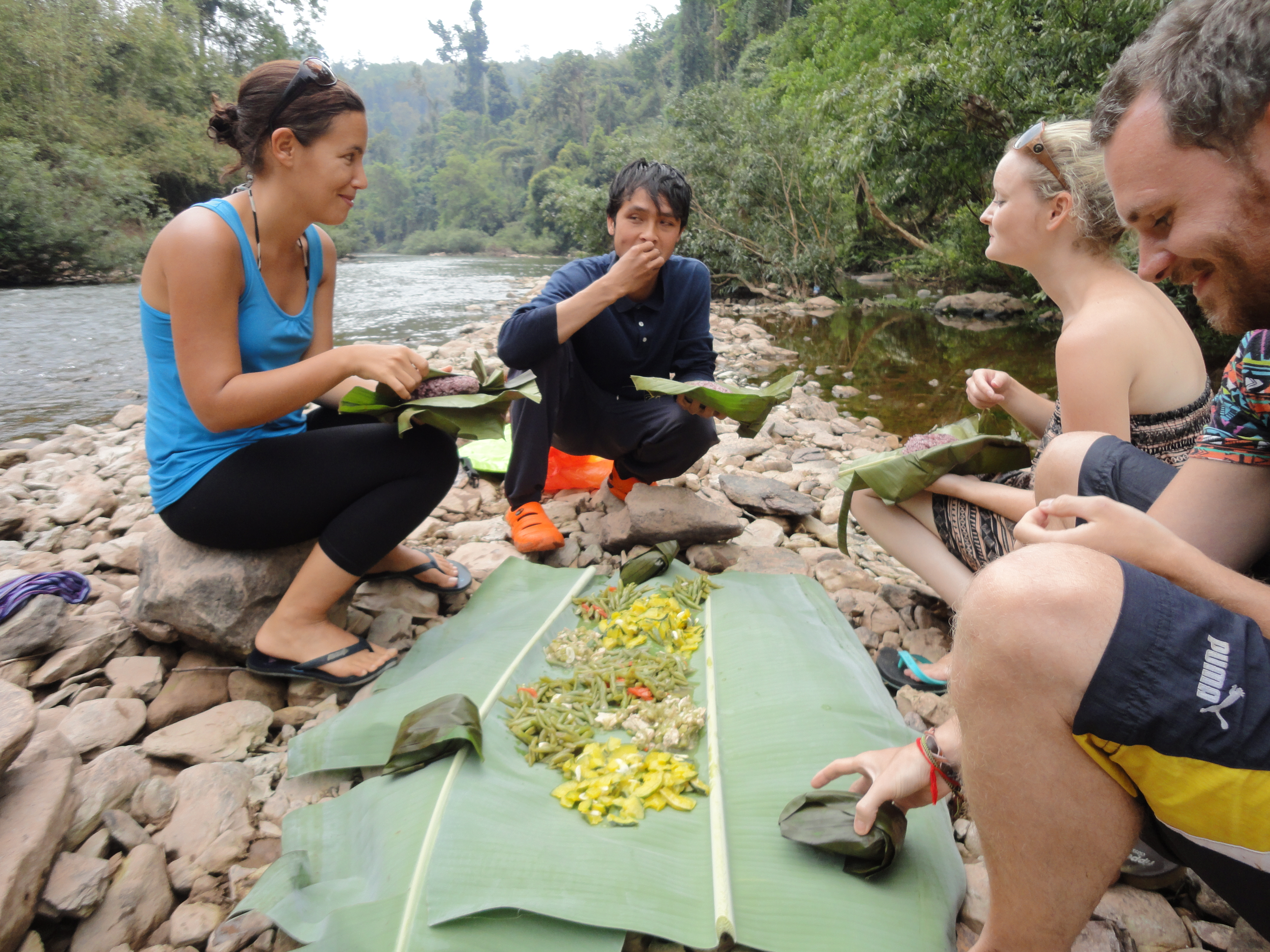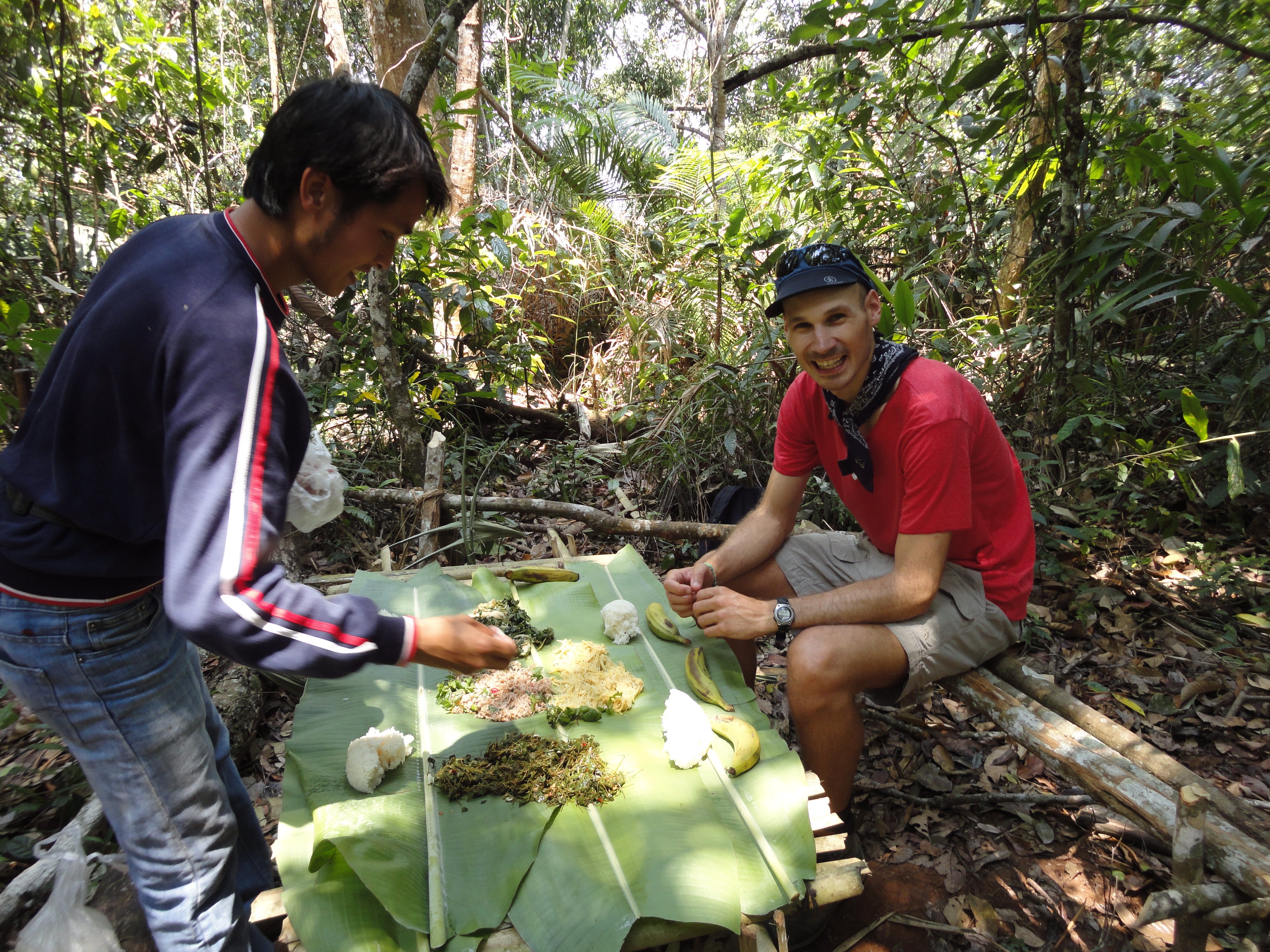 Zugegeben, die Wanderung durch den schattenspendenden Busch war nicht sehr spektakulär, doch das Wissen und die Darbietungen von Hak machte das Ganze zu einem Erlebnis. Er war als Kind viel mit seinem Grossvater unterwegs, vom dem er das meiste gelernt hatte. Für das Mittagessen konstruierte er schnell Tisch und Bank, sammelte Bananenblätter für ein Tischtuch und wir genossen die auf dem Markt gekauften frischen Gerichte. Mmmh, es schmeckte alles sehr gut, unsere Favoriten waren aber einerseits das Hühnchen mit Pfefferminz und Bambus mit dünnen Reisnudeln.