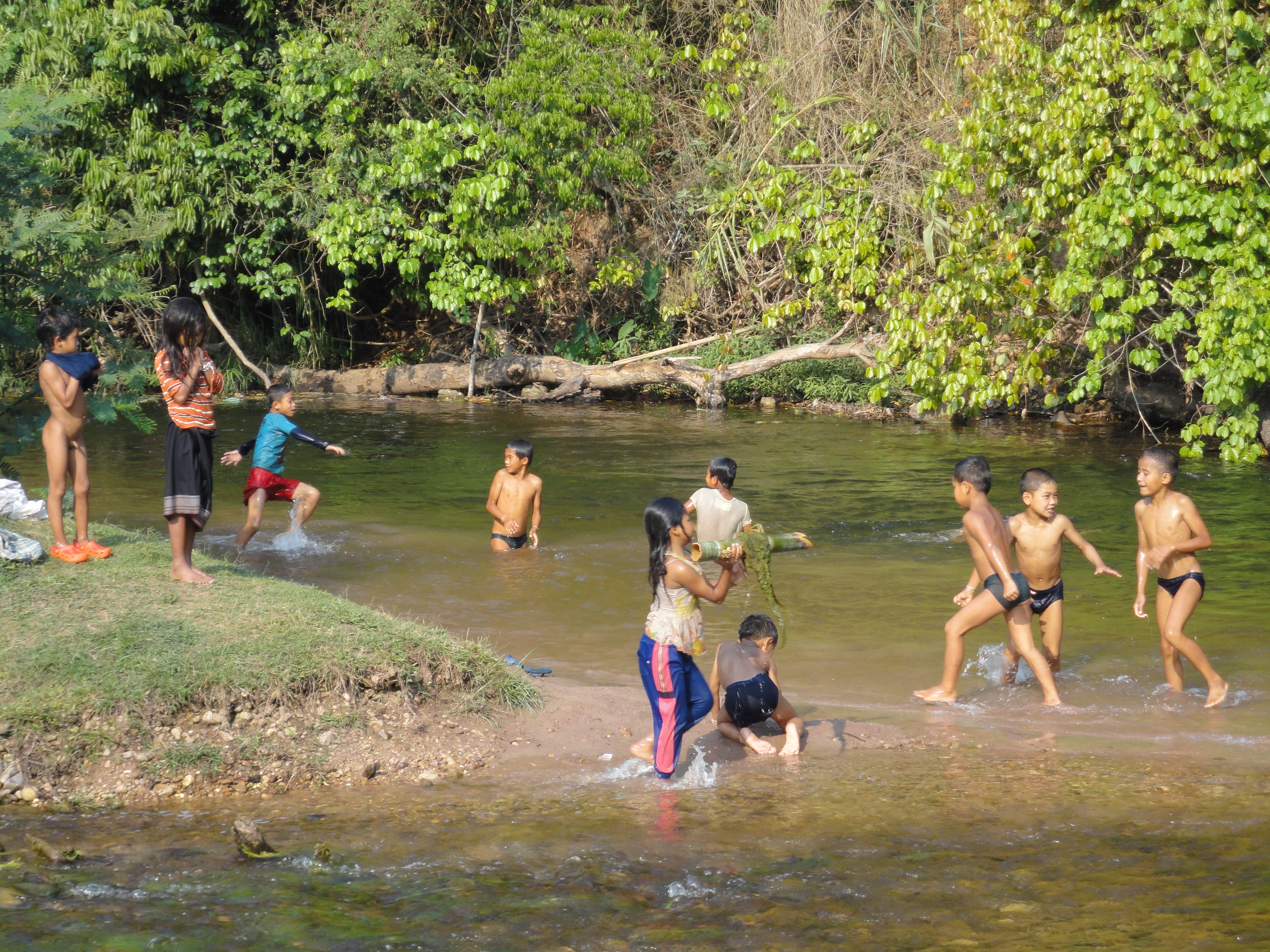 Nach fünf Stunden Buschwanderung tauchten wir in einem kleinen Dorf bei der Strasse wieder auf. Die Kinder am Wasser schrien ´Farang´ und Christian flogen erste Bälle von Seegrass entgegen. Ausländer mit weisser Hautfarbe werden als Farang bezeichnet und manche Eltern erzählen ihren Sprösslingen Schauergeschichten wie: ¨Falls du jetzt nicht brav bist kommt der kinderfressende Farang.¨ Wir genossen das erfrischende Bad mit den Kindern und wie wir schnell merkten, hatten die Segrassbälle nichts mit der Angst vor dem Farang zu tun.
