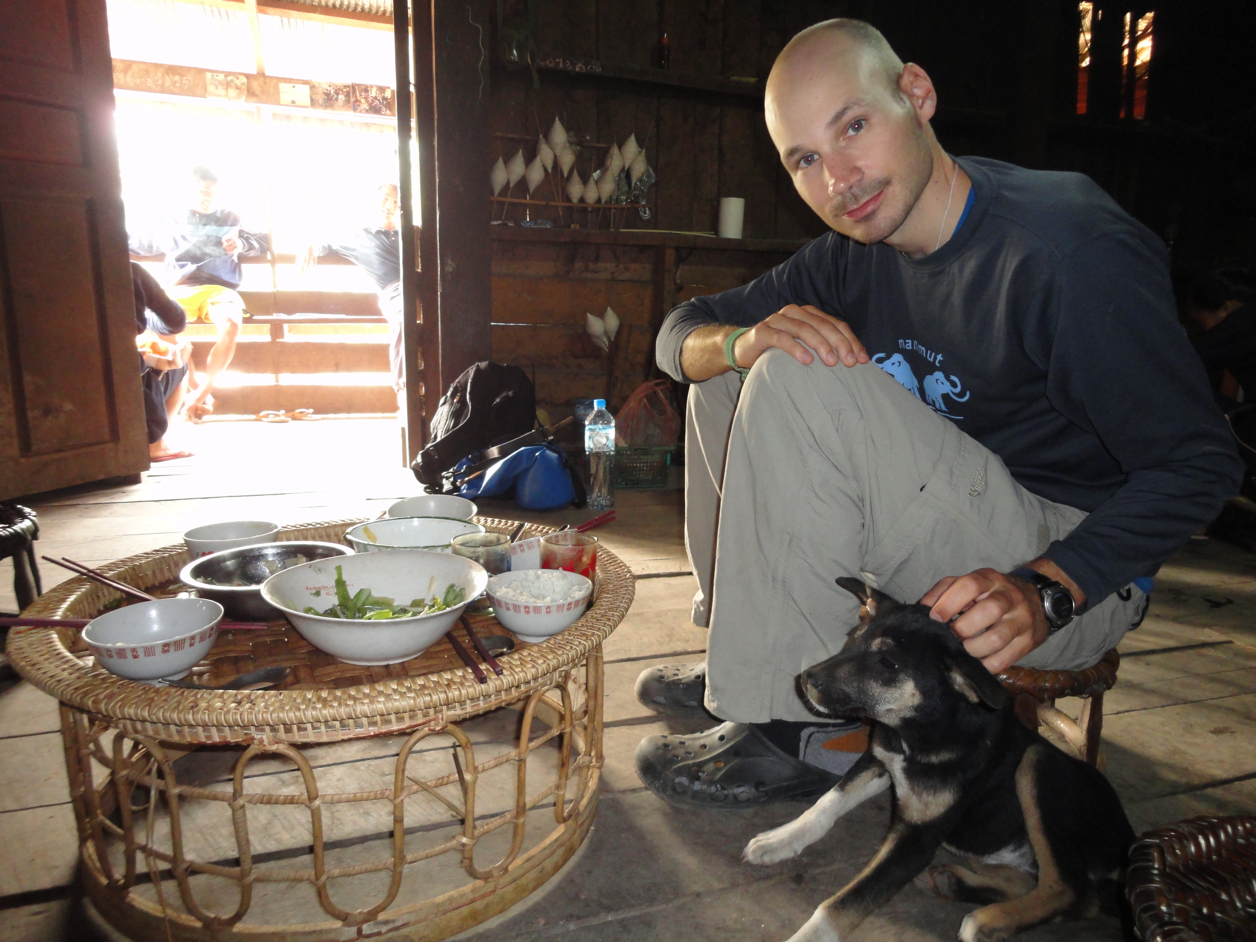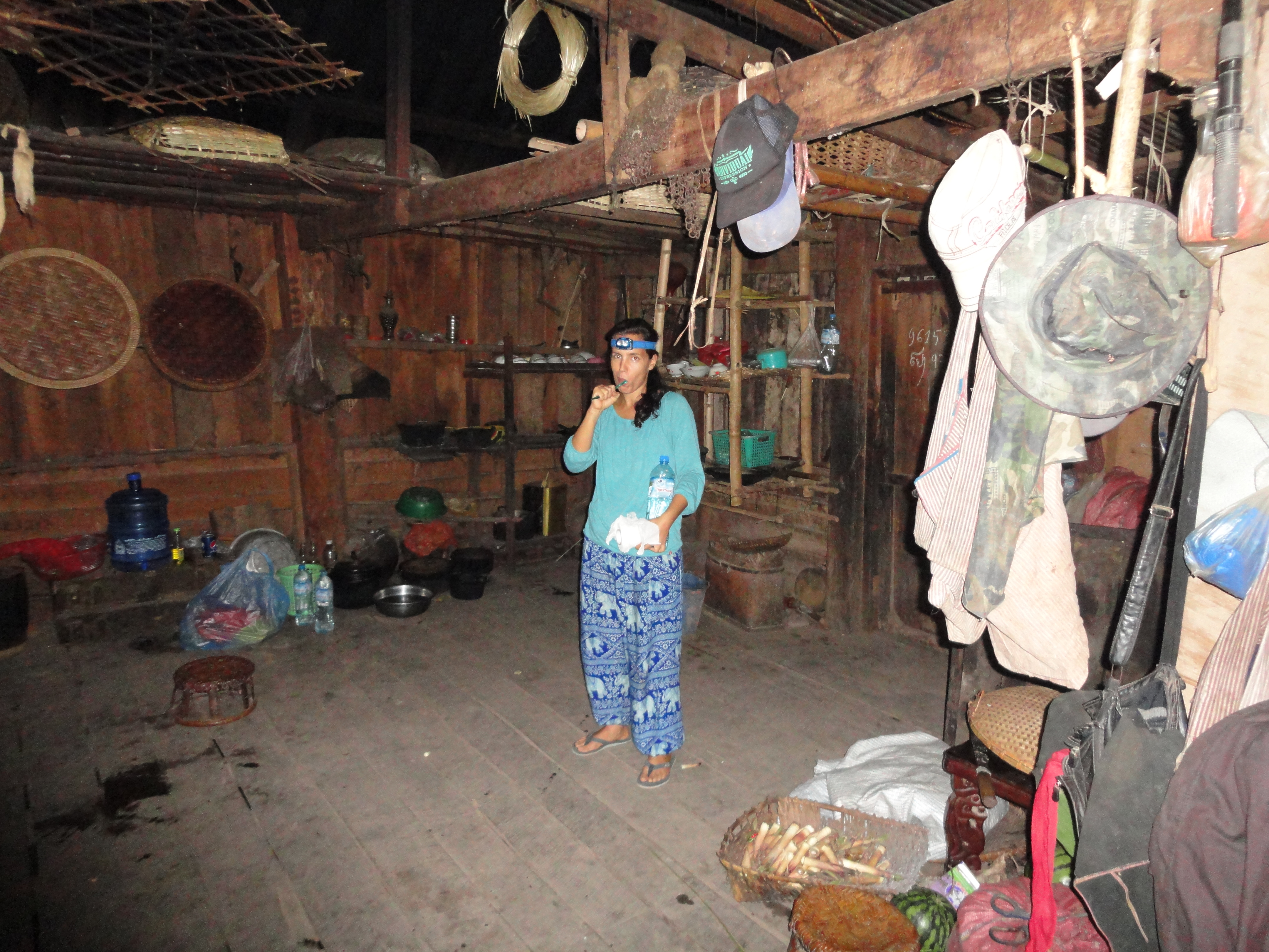 Wir übernachteten in einem Dorf der Khmus, einer ethnischen Minderheit im Norden von Laos. Einfache Häuser auf Stelzen und die offenen Kochstellen versetzten uns in eine Welt der Vergangenheit. Wir waren wieder die einzigen Westler im ganzen Dorf und zu Gast bei einer lieben Familie, mit der wir das Nachessen genossen. Unser Guide Hak wusste nicht nur wahnsinnig viel über die Kultur und den Wald, sondern ist auch ein begnadeter Koch. Mit den gesammelten und auf dem Markt gekauften Zutaten bereitete er alleine das Nachtessen für uns und die einheimische Familie zu. Wie hier üblich, werden mehrere, mit Essen gefüllte Schalen auf den Tisch gestellt, von welchen sich jeder mit seinen Stäbchen oder einem Löffel bedienen kann. Gerichte mit Tofu und Gemüse, die aus dem Wald mitgebrachten Bambussprossen, Hühnchen mit Tomaten und noch andere Speisen wurden uns aufgetischt. Dazu erhält jeder noch eine grosse Portion Reis. Zur Feier des Tages bot uns die Familie von ihrem speziellen Reis an, welcher royalblau war und herrlich nach Zimt duftete.