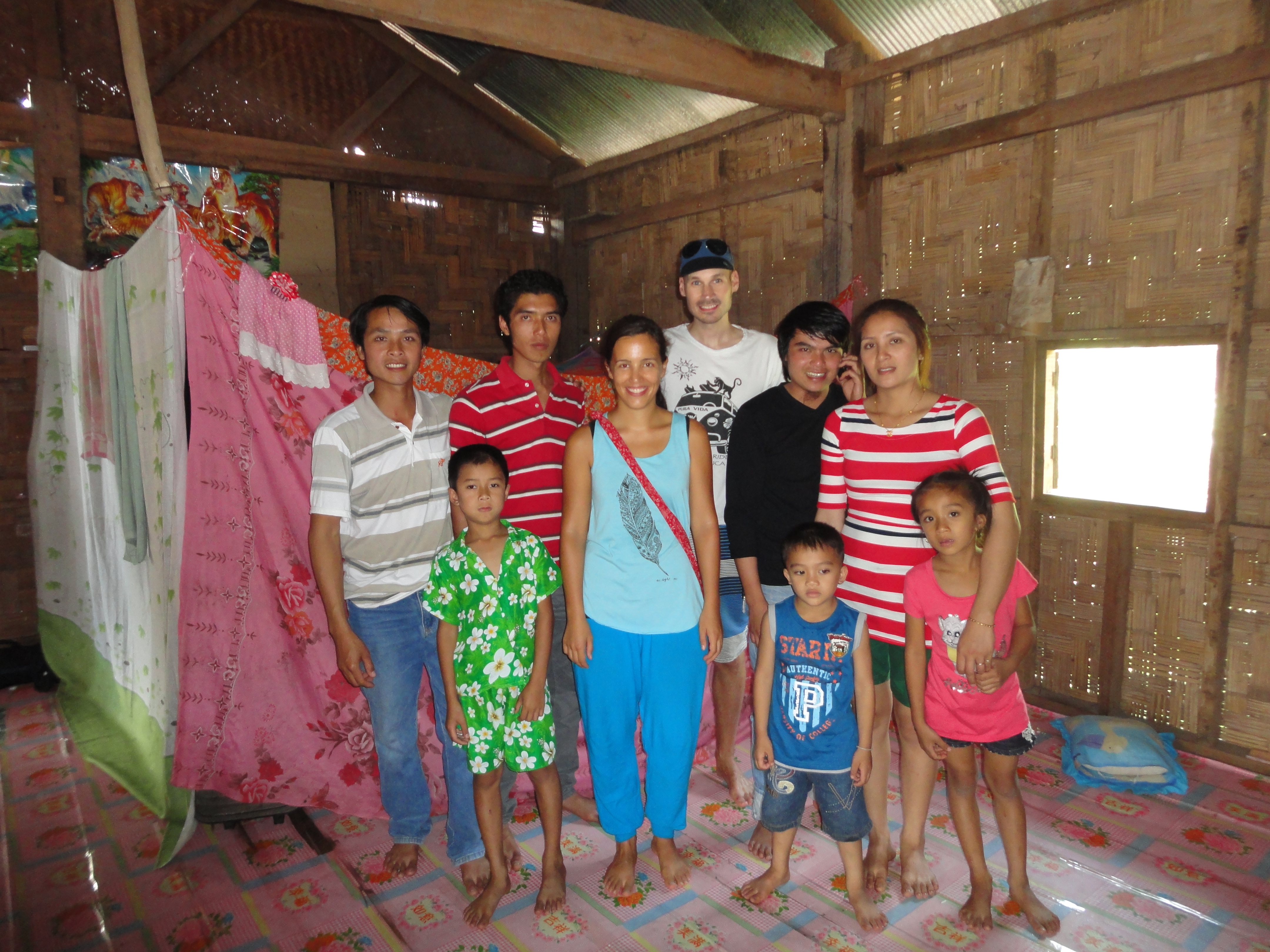 Gespannt nahmen wir die Bambusbrücke über den Fluss zum verabredeten Treffpunkt. Schön gekleidet erwartete uns Hak dort schon und führte uns zu seinem Heim. Wir wurden seinen Eltern, den Onkeln und seinen von weit her gereisten Geschwistern vorgestellt. Unbedingt sollten wir auf ein Bild mit seinen beiden Brüdern und seiner Schwester und deren Kindern. ¨Heute, meinte er mit ernster Mine, ¨seid ihr Teil meiner Familie.¨