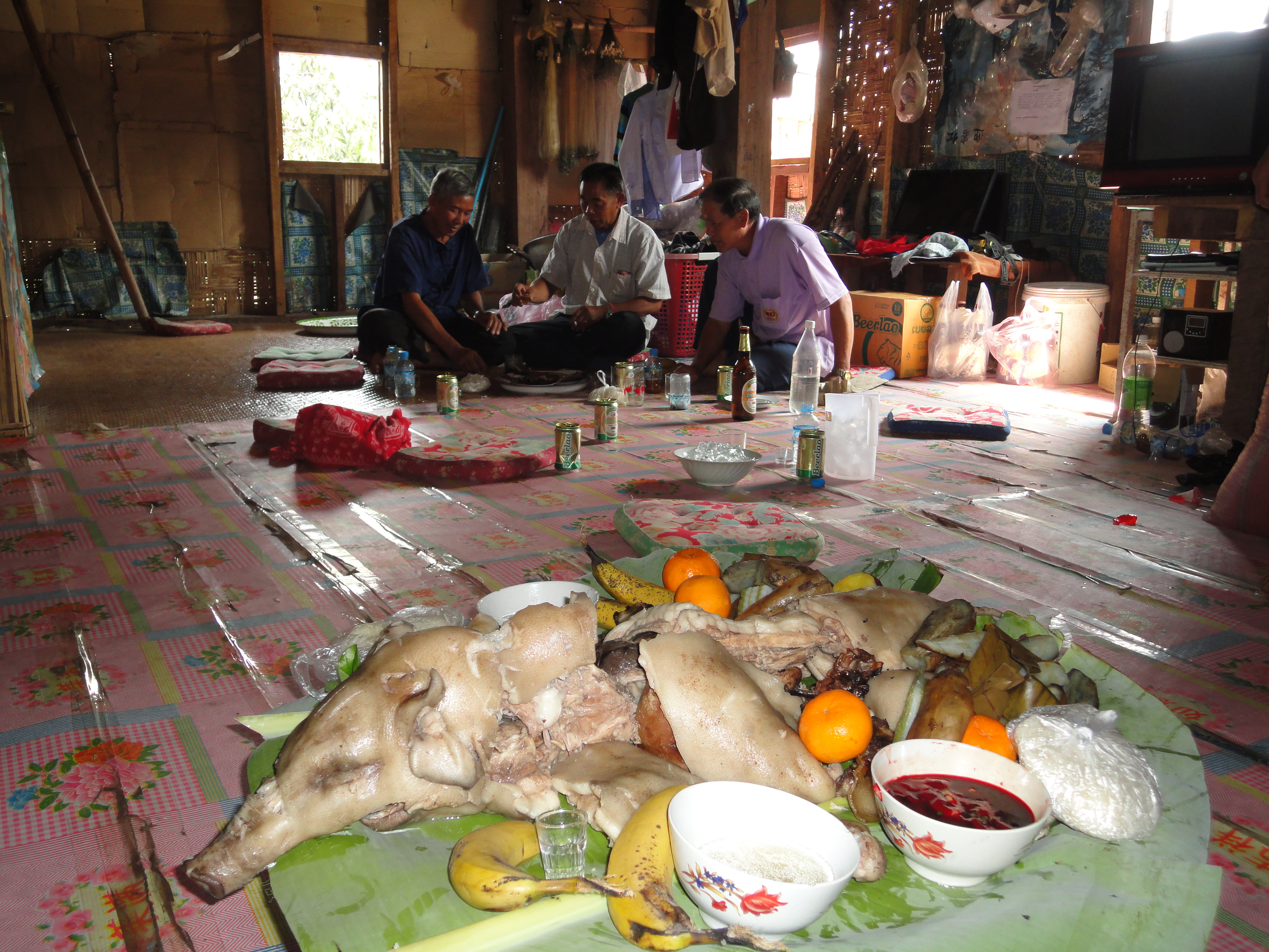 Nach dem offizielem Teil im Wohnraum gings weiter zum Essen und vor allem zum Trinken nach draussen. Und es wurde gebechert, was das Zeug hielt. Bier und der bekannte Schnapps LaoLao flossen in Strömen. Die Laoten wissen zu feiern und auch uns wurde kräftig eingeschenkt. Da wir nicht gefragt, ob jemand noch zu trinken möchte, nein es wird einfach nachgeschenkt .