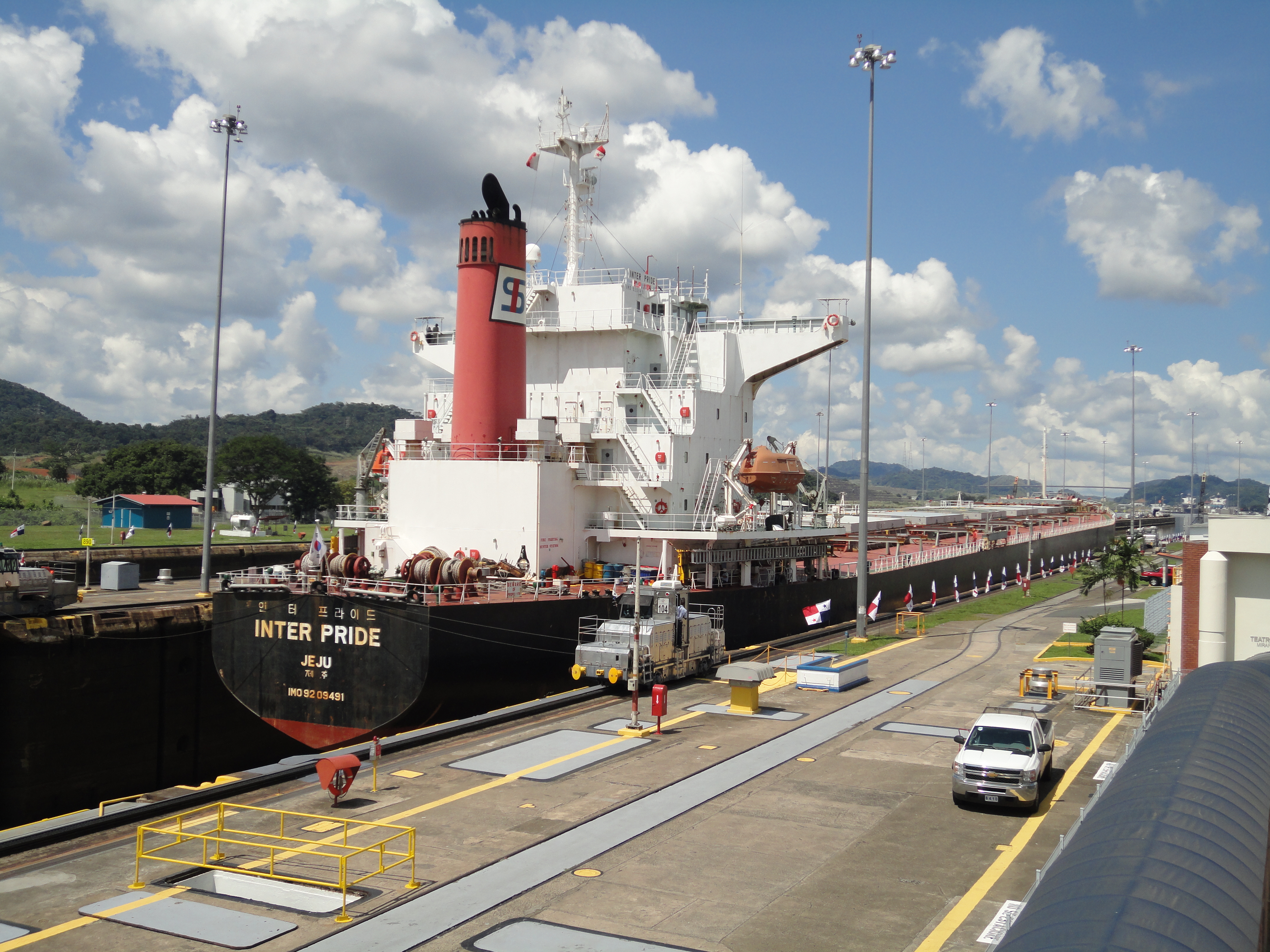 Aus dem Pazifik fährt ein japanischer Frachter in die erste Schleuse hinein. Maximal Länge beträgt 294, die Breite 32 Meter. Das Schleusentor wird geschlossen und in ca. 8 Minuten wird die Schleusenkammer mit etwa 40 Mio Liter Wasser gefüllt. Das Boot steigt mit dem Wasser um 8 Meter in die Höhe.